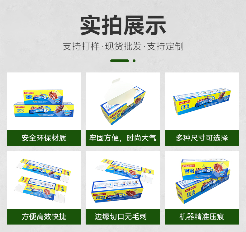 保鮮膜盒、保鮮袋盒、密封袋盒定做:白卡紙,過膜,過油,彩印;來圖定做或委托設(shè)計(jì)。